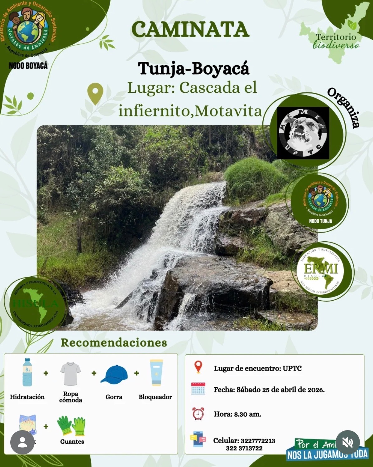 Este sábado 25 de abril a las 8:30 a.m., realizaremos una caminata hacia la Cascada El Infiernito (Motavita), un sendero cercano a la UPTC que nos permitirá desconectarnos de la rutina, desestresarnos y conocer la riqueza ecológica de nuestro territorio, y entender la crisis del agua en Tunja 💧