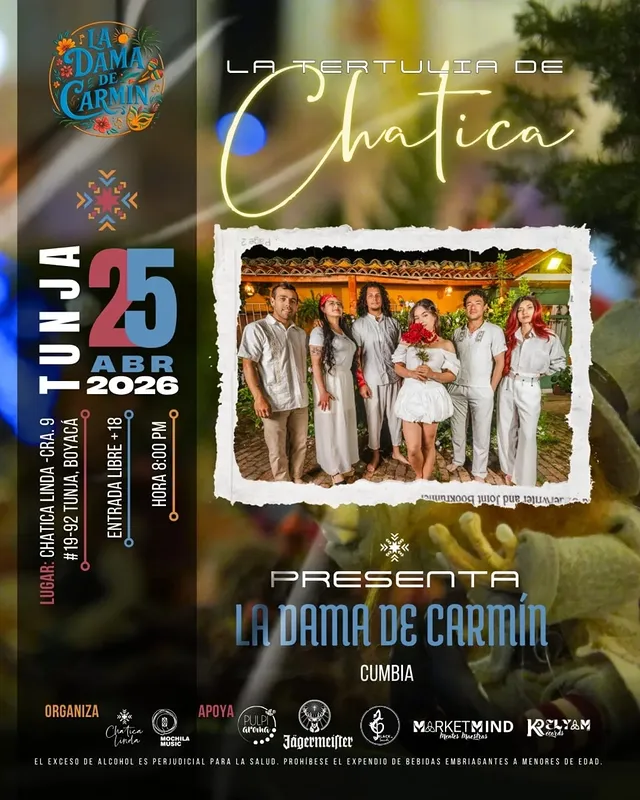 Ver origen del eventoEste sábado 25 de abril de 2026, la Tertulia de Chatica se llena de ritmo, fuerza y conexión con nuestras raíces. 🔥 La Dama de Carmín llega a la casa con una energía que se baila, se canta y se siente en el alma. Una noche donde la cumbia nos reúne, nos mueve y nos recuerda de dónde venimos. Entre tambores, voces y fuego escénico… la casa se transforma en celebración. Porque en Chatica la música no es solo sonido, es encuentro, es historia y es vida. 📍 Chatica Linda – Tunja